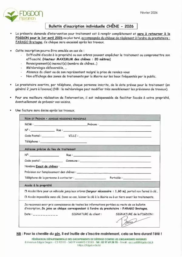 Demande d'inscription pour le traitement des chênes